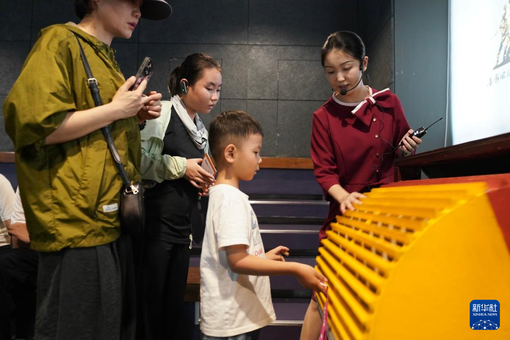 8月7日,小朋友在長影舊址博物館擬音互動室參觀體驗。