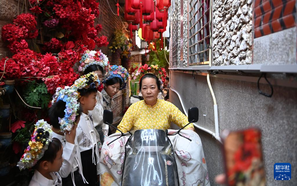 8月18日,福建泉州蟳埔村,一名蟳埔女騎電動車從幾名體驗“簪花圍”的游客前經過。
