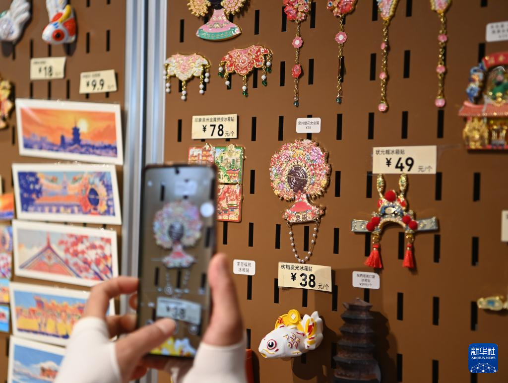 8月18日,福建泉州蟳埔村,一名參觀者在拍攝簪花造型冰箱貼。