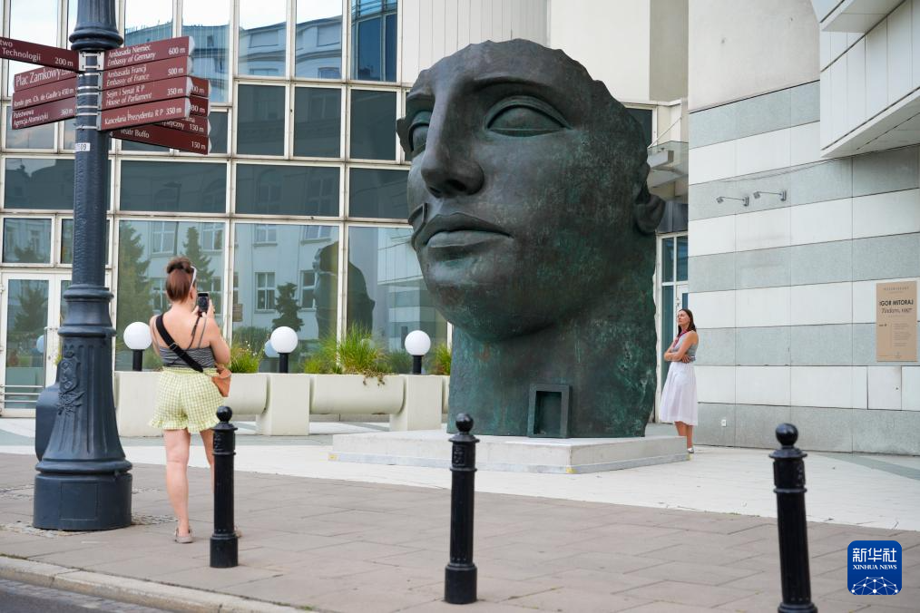 9月5日,在波蘭首都華沙,游客與雕塑《廷達羅》合影。