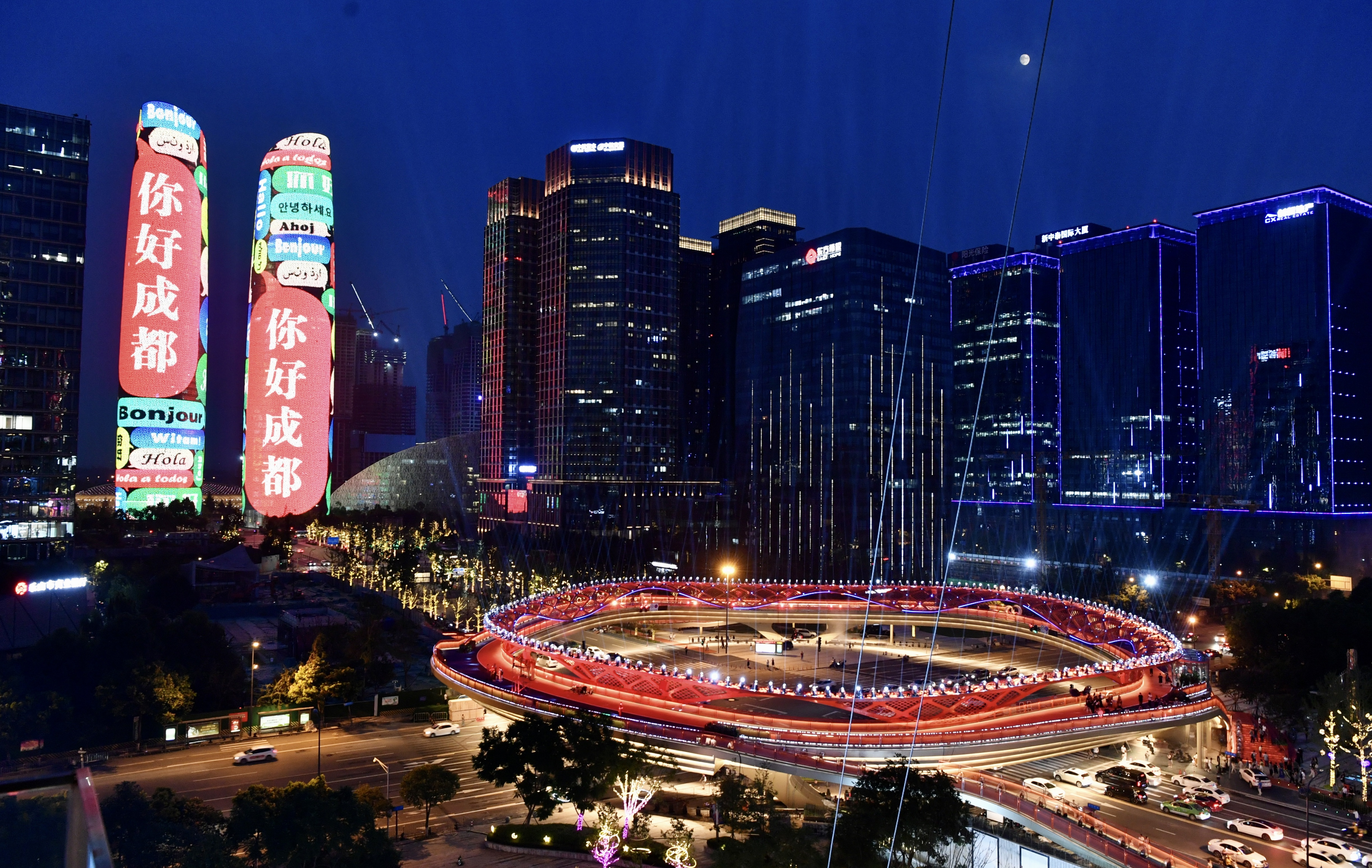 成都交子公園商圈的交子大道上,絢麗斑斕的景觀橋梁“交子之環”與天府雙塔交相輝映。新華社發(成都市高新區宣傳部供圖)