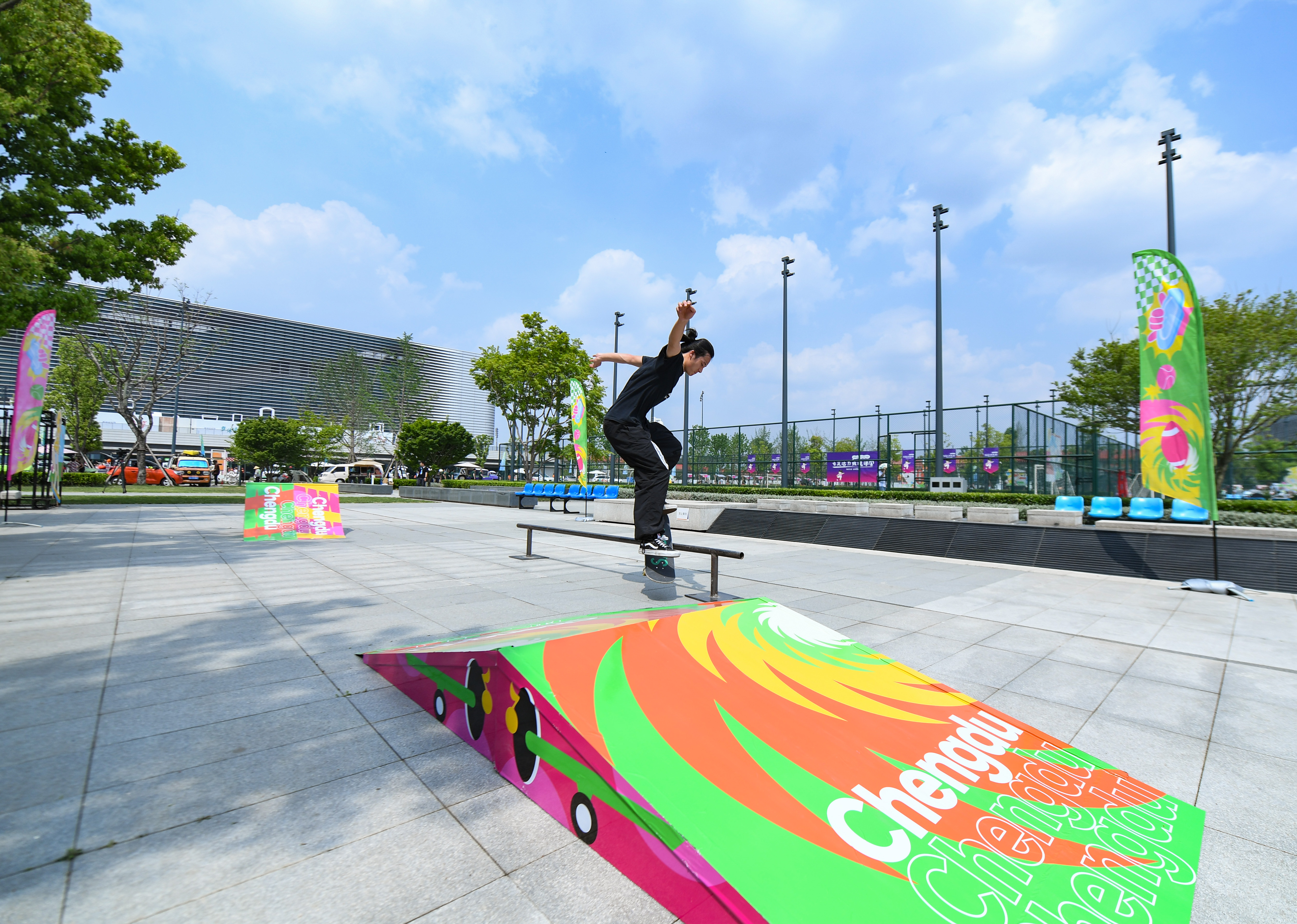 4月19日,在成都東安湖體育公園,體育愛好者在 “潮流運動會”上練習滑板。新華社記者 王曦 攝