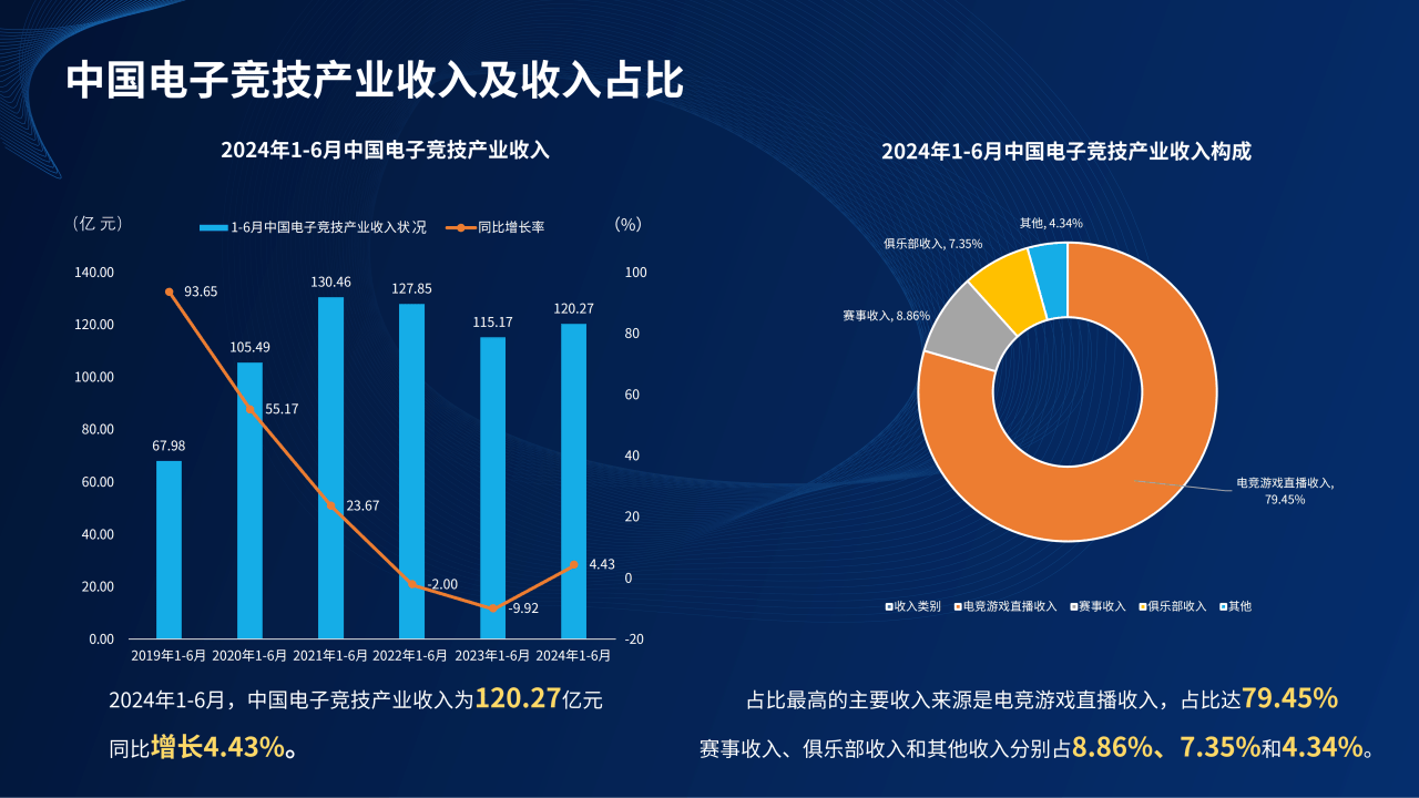 作為新興體育產業,電競頗受關注。中國音像與數字出版協會此前發布的《2024年1-6月中國電子競技產業報告》顯示,我國電子競技用戶規模為4.9億人,同比增長0.52%;電子競技產業上半年收入為120.27億元,同比增長4.43%。