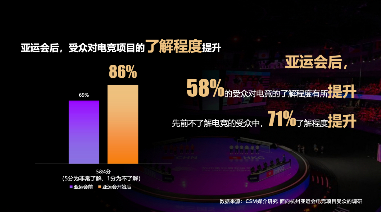 中央廣播電視總臺國家電子競技發展研究院數據顯示,通過轉播亞運會電競相關賽事及版權分銷,央視電競項目報道在總臺自有平臺總觸達2.02億人次,各新媒體平臺累計觀看3.7億人次。杭州亞運會前對電競項目不了解的受眾中,有71%表示在亞運開始后對電競項目的了解程度有所提升;在杭州亞運會前對電競項目略有了解的受眾中,有58%表示在杭州亞運會后對電競項目的了解程度有所提升。