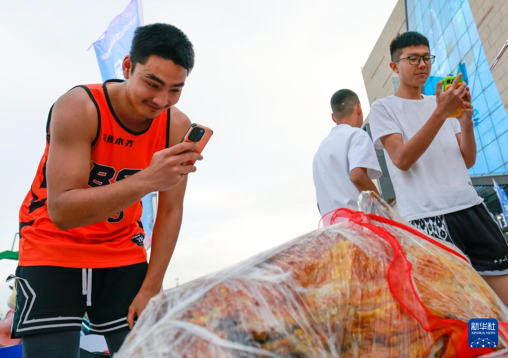 5月5日,101隊球員凱迪爾丁·開熱曼(左一)拍攝冠軍獎品——一只新鮮出爐的烤全羊。最終,101隊獲得當周比賽的冠軍。