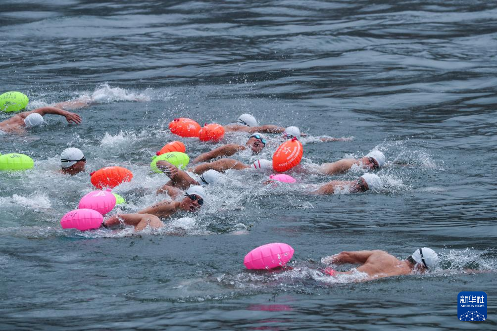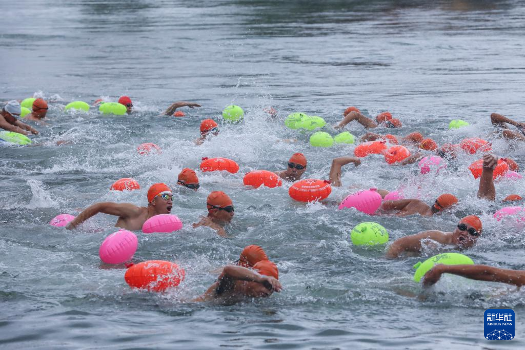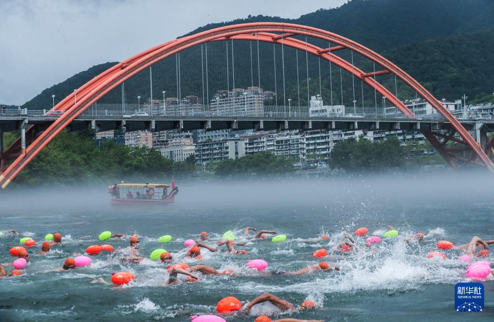 7月27日,參賽選手們躍入新安江中參加“夏日冬泳”。