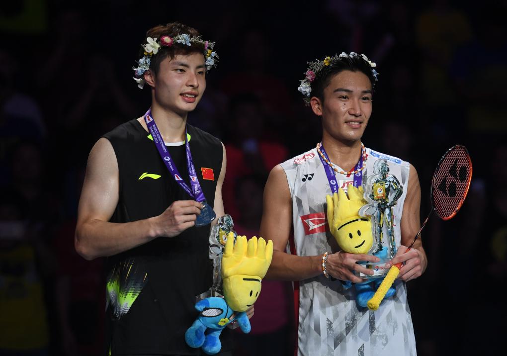 2018年8月5日,石宇奇(左)和桃田賢斗在世界羽毛球錦標賽男子單打頒獎儀式上。新華社記者 季春鵬 攝