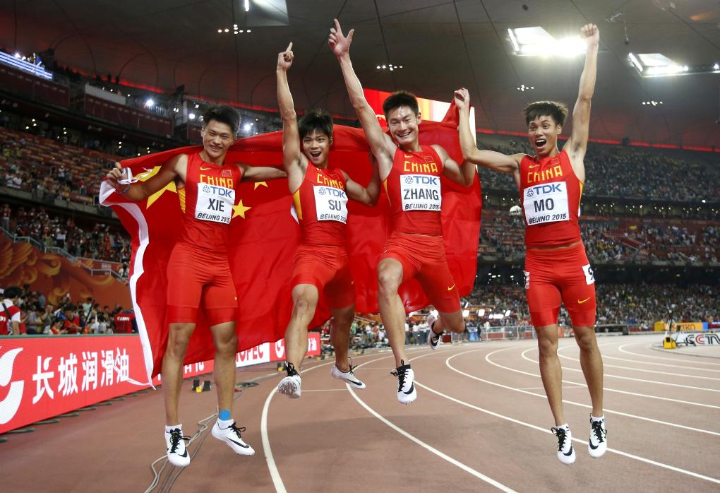 2015年8月29日,在北京田徑世錦賽男子4X100米接力決賽后,中國隊選手謝震業、蘇炳添、張培萌和莫有雪(從左至右)慶祝獲得銀牌。新華社記者王麗莉攝