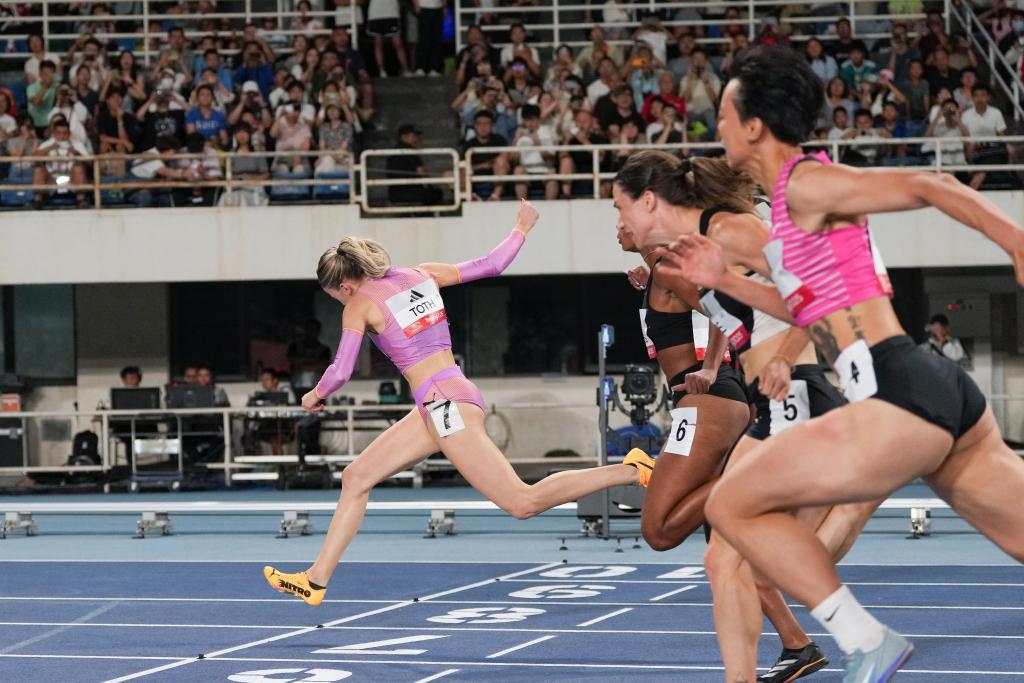 9月7日,2025年世界田聯洲際巡回賽(金標)北京站女子100米欄比賽,匈牙利選手安娜·托特(左一)在比賽中沖線。新華社記者 鞠煥宗 攝