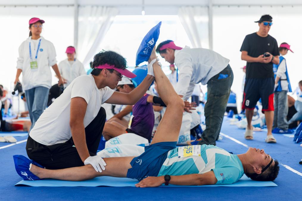 9月21日,衡馬服務人員向完賽選手提供拉伸服務
