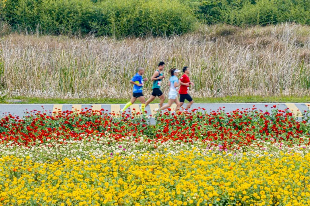 2024年11月24日,2024池州馬拉松在池州市蓮花臺廣場舉行,圖為參賽選手在花海賽道中奔跑。組委會供圖