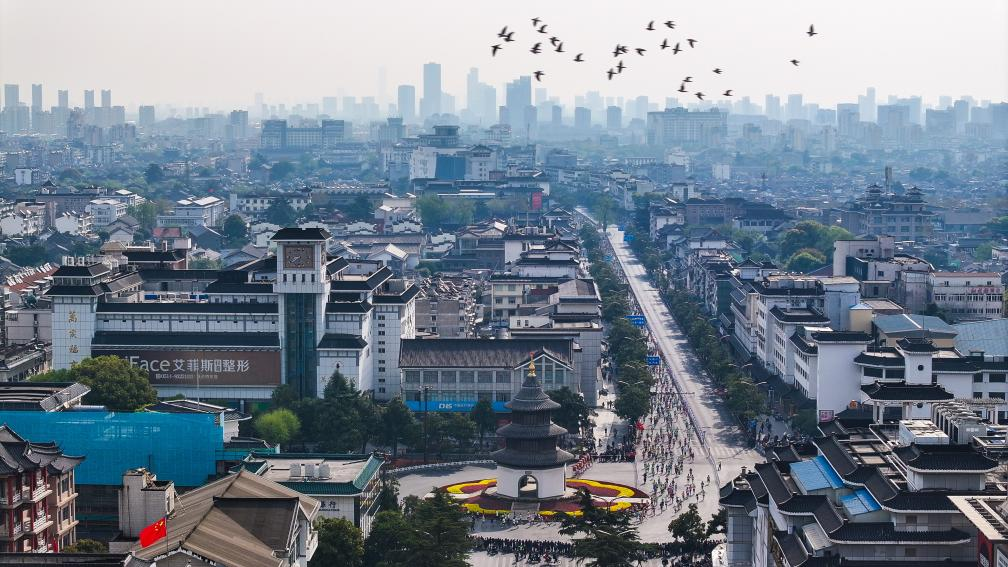 3月30日,參賽選手跑過揚州地標文昌閣(無人機照片)。當日,2025揚州鑒真半程馬拉松暨大運河馬拉松系列賽(揚州站)在江蘇省揚州市鳴槍開跑。新華社發(齊立廣攝)
