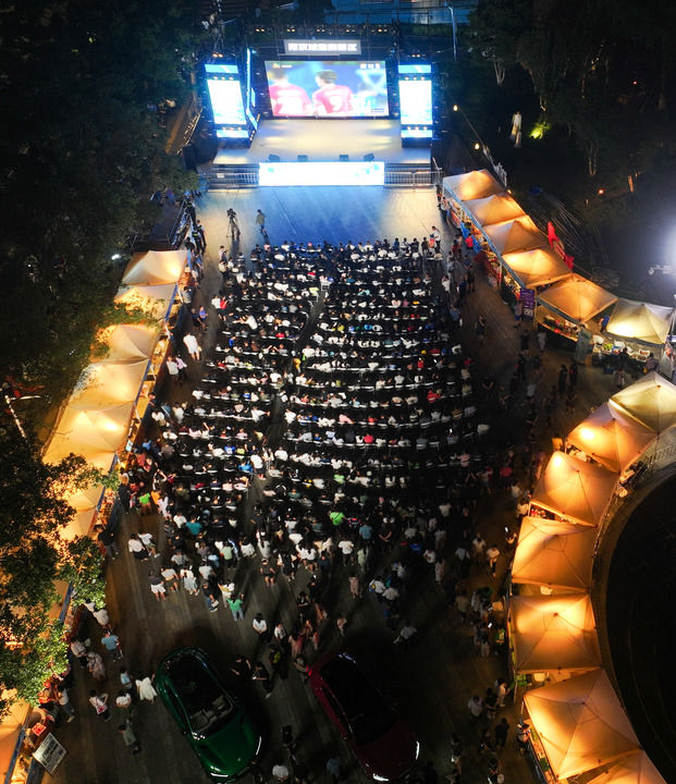 8月17日,球迷在南京一個露天屏幕前觀看2025江蘇省城市足球聯賽(“蘇超”)第九輪比賽。新華社記者 季春鵬 攝