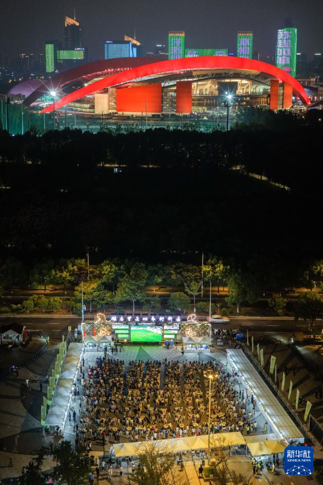 10月4日,球迷在南京市建鄴區銀杏里文化藝術街區的“蘇超”“第二現場”觀賽。