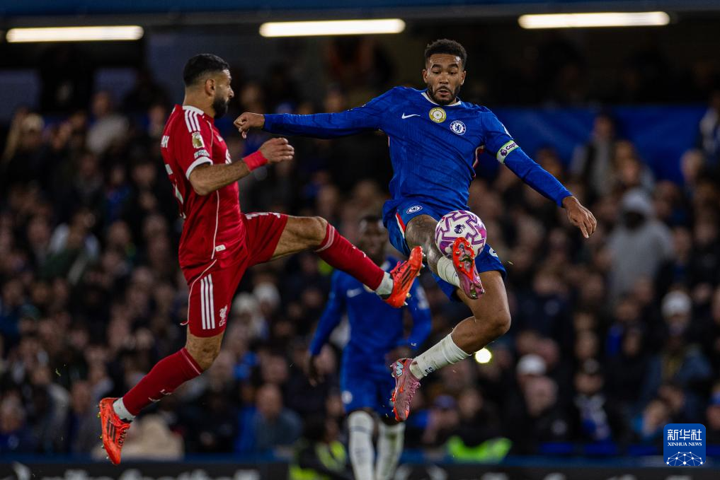10月4日,切爾西隊球員詹姆斯(右)與利物浦隊球員薩拉赫拼搶。