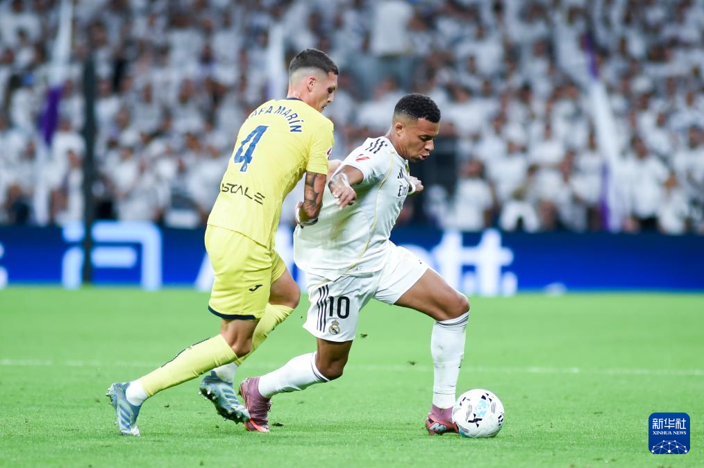 10月4日,皇家馬德里隊球員姆巴佩(右)和比利亞雷亞爾隊球員馬林在比賽中拼搶。