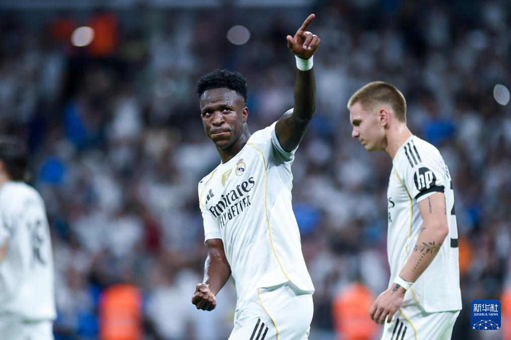 10月4日,皇家馬德里隊球員維尼修斯(左)在比賽中慶祝進球。