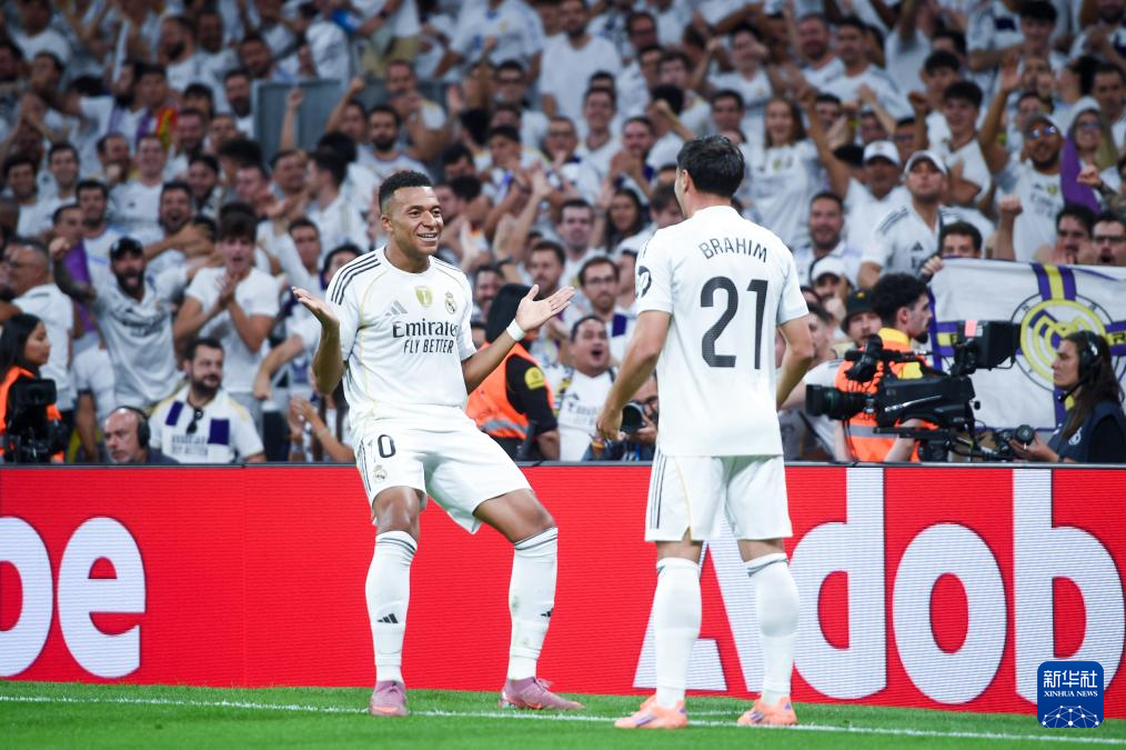 10月4日,皇家馬德里隊球員姆巴佩(左)和布拉欣·迪亞斯在比賽中慶祝進球。