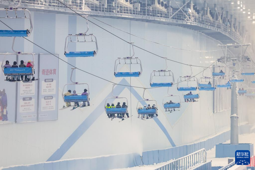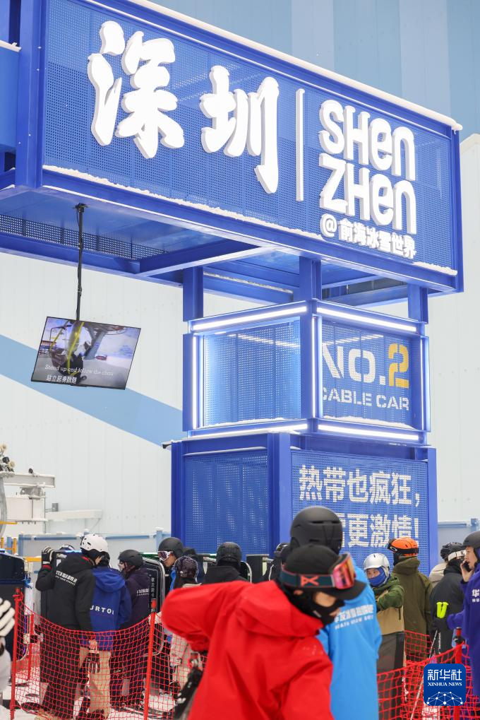 10月7日,滑雪愛好者在深圳·前海冰雪世界乘坐纜車。