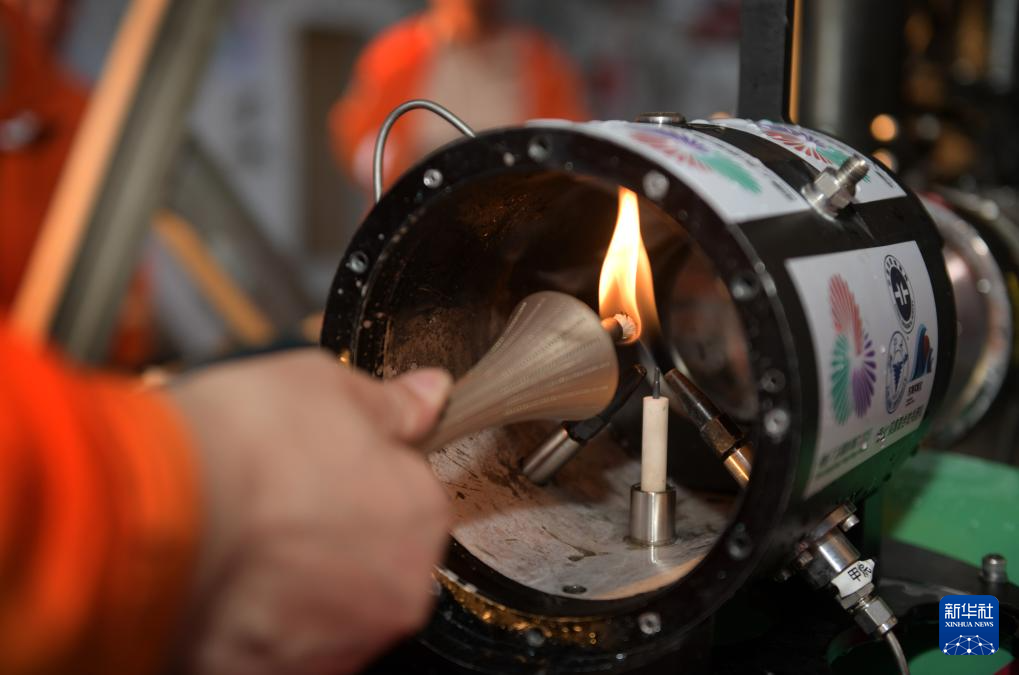 在科考船甲板面,“源火”采集組副組長,廣州海洋地質調查局副總工程師沙志彬(左)用引火棒將“源火”轉移至“源火”盒(9月18日攝)。