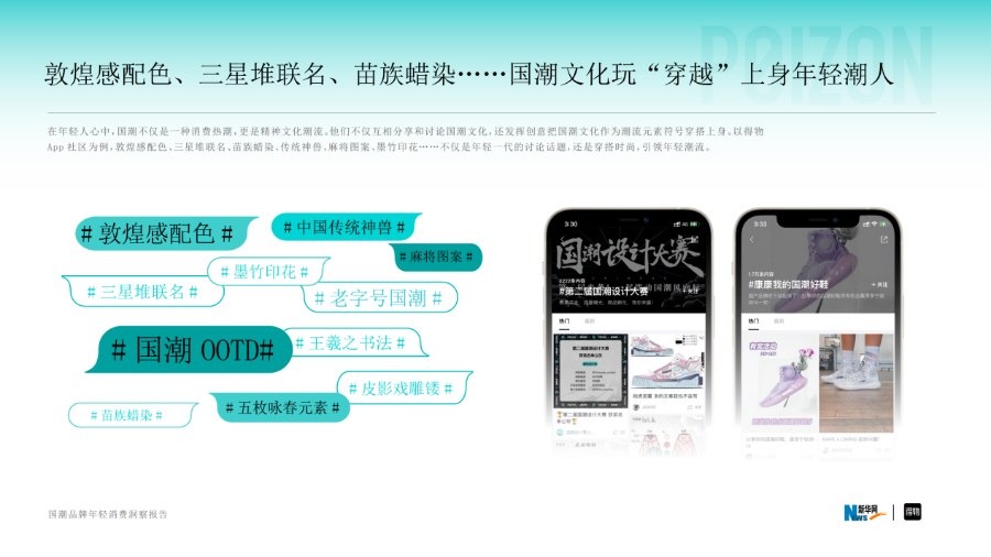 年輕一代作為當下國潮消費主力,正激發國潮創新的潛力;此外,重視精神價值、分享表達的年輕人,還與國潮品牌進行深度共創,讓品牌背后寄托的傳統文化在年輕人中傳承。《報告》以得物App社區為例,敦煌感配色、三星堆聯名、苗族蠟染、傳統神獸、麻將圖案、墨竹印花、中國錦鯉等國潮文化符號,不僅是年輕人的討論話題,還是他們的穿搭時尚,讓國潮不僅是一種消費熱潮,更是精神文化潮流。