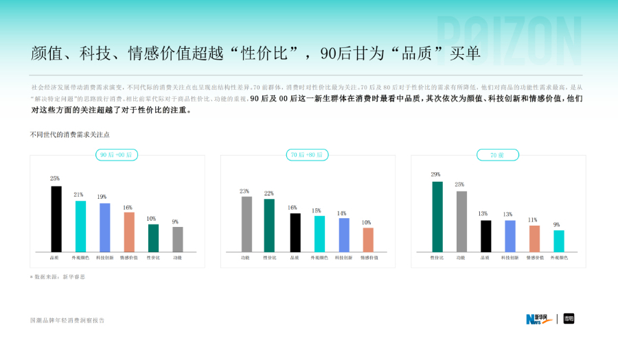 據悉,報告以年輕消費者最為聚集的“得物App”為研究樣本,通過國潮行業透視、品牌案例剖析、年輕消費趨勢等三大維度,新時尚、新文化、新科技、新生活、新過節等五大場景進行數據發布和分析。報告顯示,90后及00后在消費時最看中品質,同時關注顏值、科技創新和情感價值,甚至超越 “性價比”。年輕人需求的結構性新變化,為國潮品牌開辟“新供給”,也為更多國潮品牌打開創新思路。