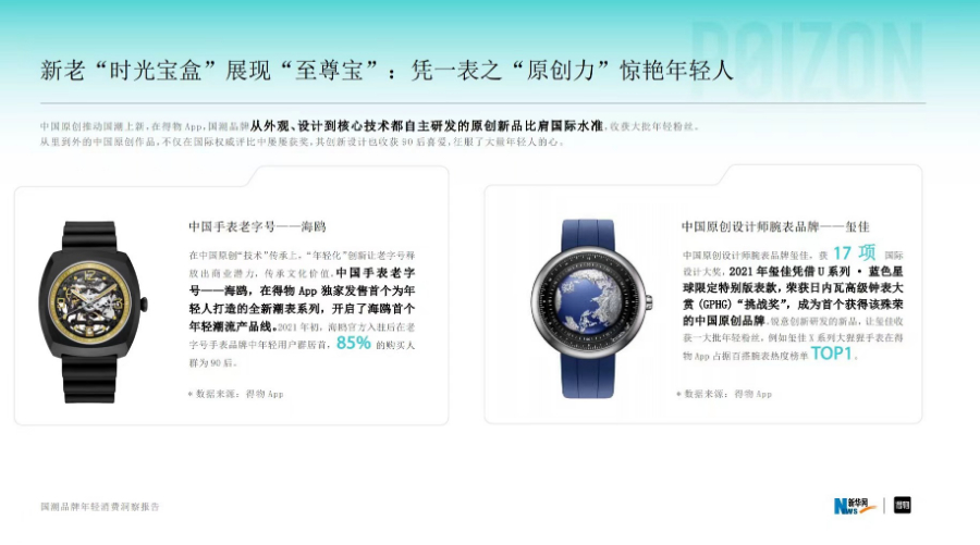 老字號品牌通過開辟年輕潮流產品線,跨界“新奇”聯名等新玩法“逆齡”生長,打破品牌固有形象和邊界,以新鮮故事圈粉90后,甚至收獲大波00后粉絲。《報告》顯示,手表老字號品牌海鷗在得物App 獨家發售首個為年輕人打造的潮表系列,85%購買者為90后;國民球鞋回力在得物App獨家首發專為年輕人打造的跨界聯名新品,發售一周內即告售罄。