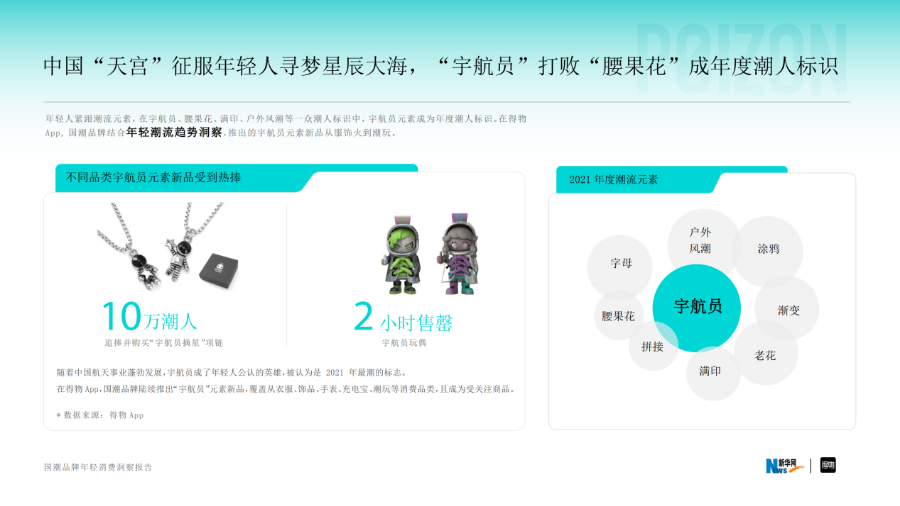 報告顯示,國潮品牌新品已覆蓋鞋履、服裝、數碼、箱包、手表、美妝、配飾甚至藝術品,滿足年輕人的全面消費需求,受到年輕人喜愛。例如,隨著中國人首次進入自己的空間站,年輕人因為中國航天技術的突破,有超過10萬人扎堆得物App購買某國潮品牌首發的“宇航員”元素新品項鏈,“宇航員”限量玩偶首發2小時內即售罄。隨著全民運動健身掀起熱潮,某國潮運動品牌結合年輕趨勢洞察,在得物App獨家發布的新品“男女通吃”,在男性主流人群基礎上,收獲大批女性新用戶。