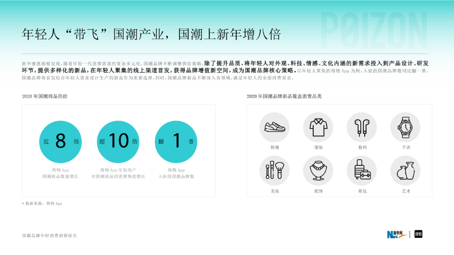 新華睿思觀察發現,年輕一代在品質、外觀、科技、情感、文化內涵五大方面呈現新需求,多元的需求結構給國潮品牌帶來機會,他們通過設計、研發多樣化新品,滿足年輕人需求,迅速擴大品牌的年輕用戶群,為品牌未來拓展空間。報告以得物App為例,2020年,得物App發售國潮新品數增長近8倍,年輕用戶對國潮商品的消費熱度增長超過10倍,不少新品一經上線即告售罄。