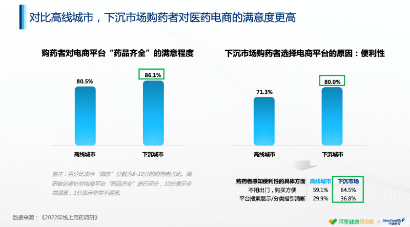 《白皮書》顯示,2019年到2021年下沉市場用戶數持續增長,其中2021年增速接近四成,超過高線城市的增速。同時,八成以上的下沉市場患者選擇線上購藥,是因為線上品類齊全,購買方便。