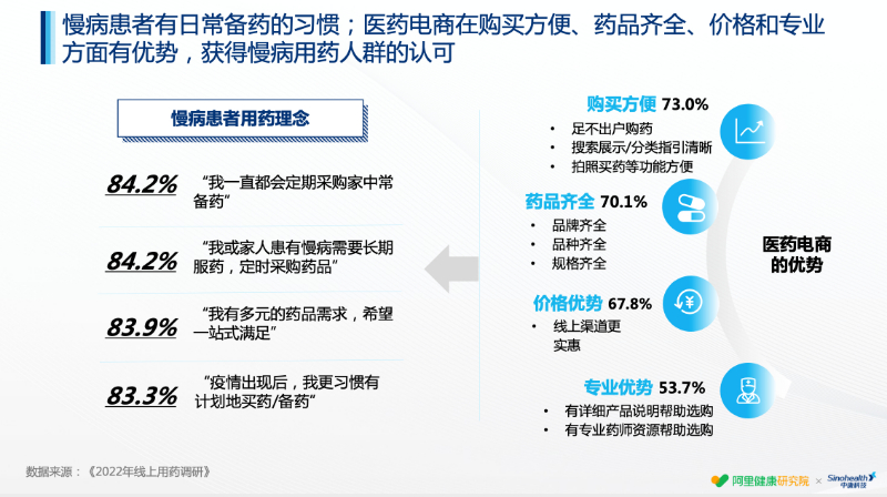 受到新冠疫情影響,線上購藥近年來增長迅速,也改變了大家的購藥習慣,這點不僅體現在人群特征上,從線下到線上,從即時性購藥到計劃性備藥等均有變化。《白皮書》顯示,疫情出現后,有近八成消費者習慣于有計劃備藥,近九成慢病患者因為線上購藥方便、藥品齊全、價格和專業等優勢,表示“我一直都會定期采購家中常備藥”。