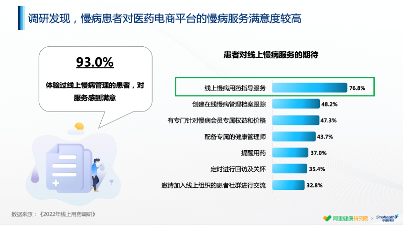 當然,對于下沉市場的慢病患者來說,除了買好藥、買到藥、收到藥,實現持續性規律用藥治療也很重要。《白皮書》顯示,2021年醫藥電商慢病用藥復購用戶數增長187%,其中下沉市場醫藥電商慢病用藥支付金額同比增長149%,超九成體驗過線上慢病管理的患者感到滿意,可見用藥可及性和依從性都得到很大提升。