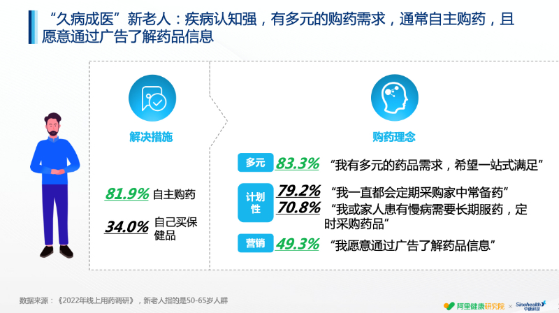 《白皮書》顯示,線上購藥人群中,女性占到六成,中青年消費者居多,而95后和新老人(50歲以上)以近七成增長率領跑其他人群,成為線上購藥“新生力量”。其中,作為互聯網時代的原住民,95后健康問題以皮膚、睡眠、用眼等輕癥為主,他們很多情況下會選擇線上問診和線上購藥,95%的95后在線上購藥前愛讀其他用戶的評論;而新老人也在擁抱數字健康生活,83%的新老人“有多元的藥品需求,希望一站式滿足”。