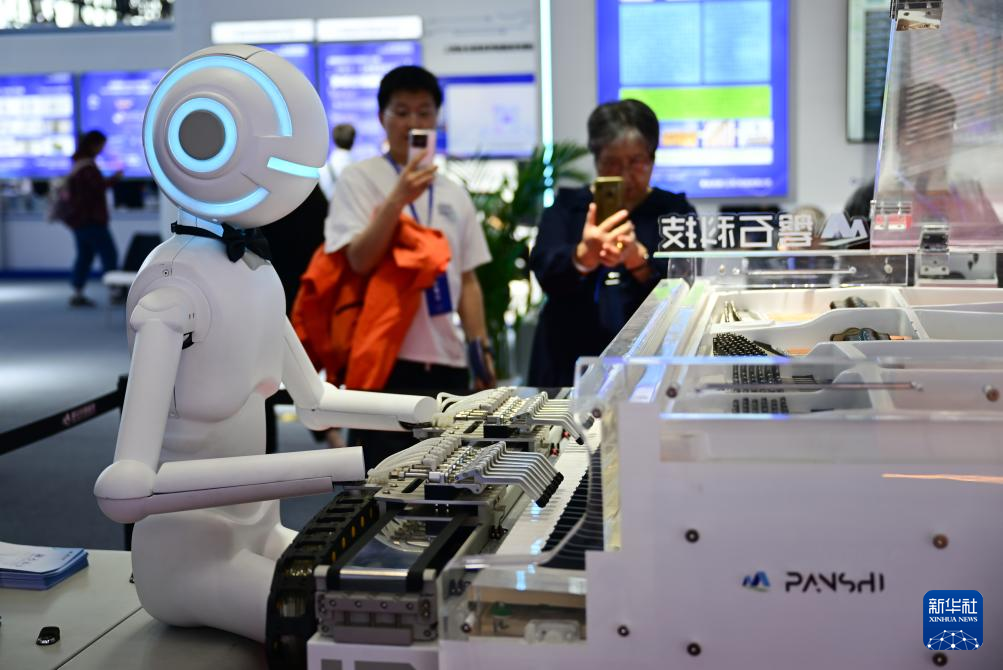 4月26日,觀眾在第三屆中國(安徽)科技創新成果轉化交易會上觀賞一款彈鋼琴的機器人。