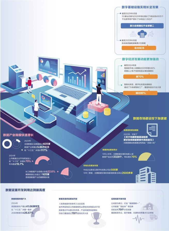 在數字經濟快速發展的基礎上,數據要素價值加快釋放。2024年,全國數據企業數量超過40萬家,數據產業規模達5.86萬億元。我國以場景牽引帶動數據要素價值充分釋放,開展公共數據“跑起來”示范場景建設。一批圍繞數據匯聚共享、開發利用的數據企業正在孕育興起,標準、規范不斷推出,數據交易日趨活躍,全國一體化數據市場正在加快構建。