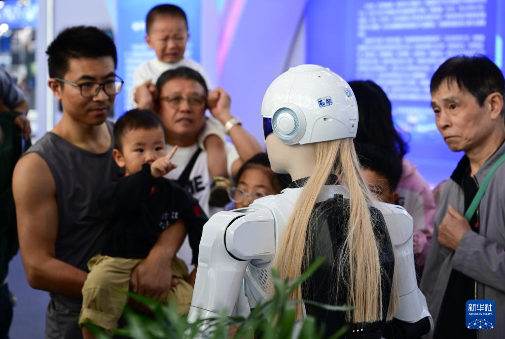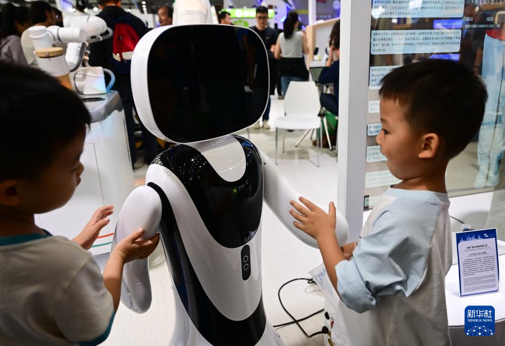 9月20日,小朋友在2025世界制造業大會智能機器人展區和一款機器人互動。