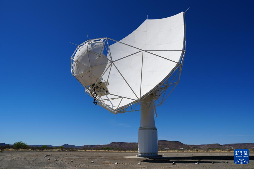 在距離MeerKAT射電望遠鏡不遠處,佇立著3臺看起來略微不同的碟狀天線,它們是由中國電科網絡通信研究院負責設計制造的SKA中頻天線,也在不時地旋轉方向和調整仰角。