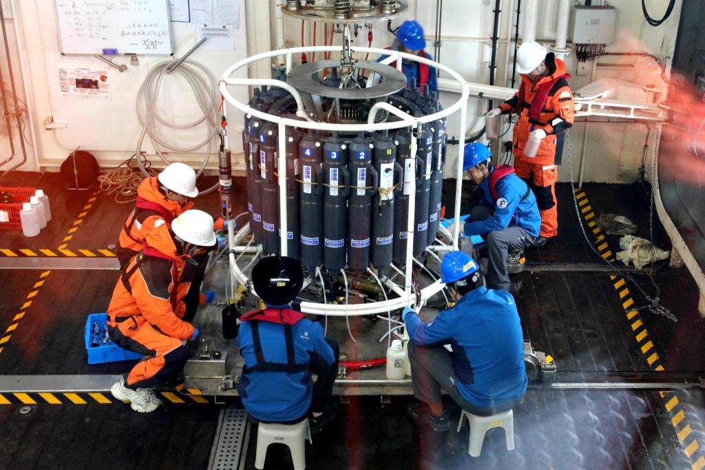 圖為考察隊員在“雪龍2”號舯甲板采集CTD帶回的水樣。新華社記者劉詩平 攝