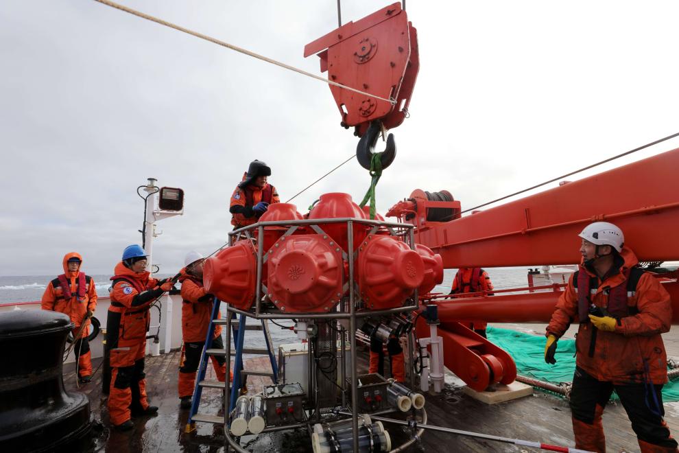 圖為科考隊員在北冰洋科考時回收Lander(生態海底著陸器)。新華社記者劉詩平 攝