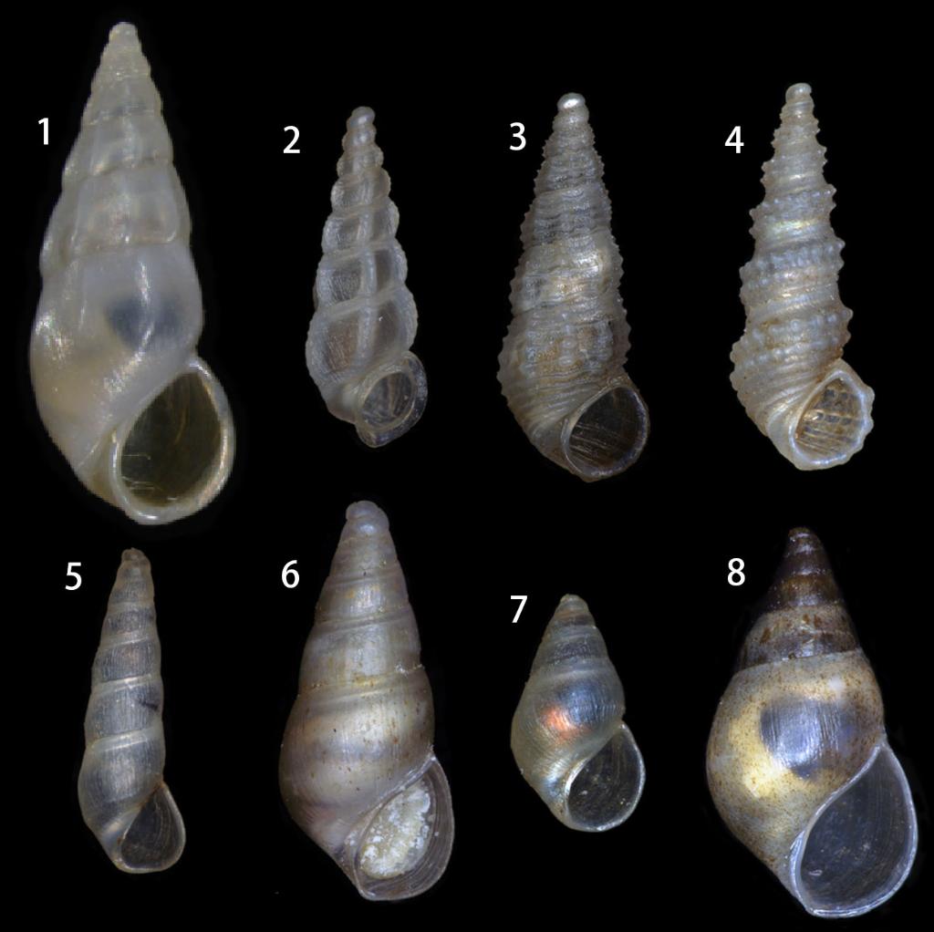 1-8分別是玻璃昆明螺、鐵锏昆明螺、流螢昆明螺、珍珠昆明螺、銀匙遠岸螺、大池遠岸螺、冰糯遠岸螺、俞元遠岸螺。中國科學院昆明動物研究所供圖