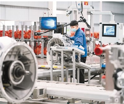 工作人員在陜西省西安市高新區的某智慧工廠內檢測變速器成品。 新華社記者 邵 瑞攝