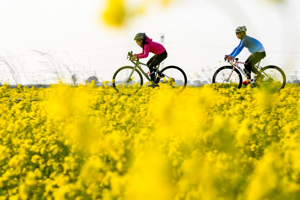 圖為2月21日,騎行愛好者在江西省樟樹市永泰鎮官湖村油菜花海中騎行、賞花。(周亮 攝)