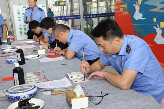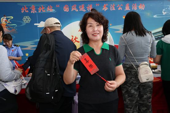 活動現場,國風元素隨處可見。北京北站書法小組的成員們現場揮毫,在設計精美的國風卡片上寫下“闔家團圓”“國泰民安”等真摯寄語,筆鋒或靈動飄逸,或沉穩有力。墨香與節日氛圍交織間,旅客紛紛駐足圍觀、拍照記錄,這份傳統與現代交融的溫情場景,正是“城市會客廳”開放、包容、有溫度的生動寫照——來自五湖四海的人在此相聚,共享文化魅力,感受城市的溫情。