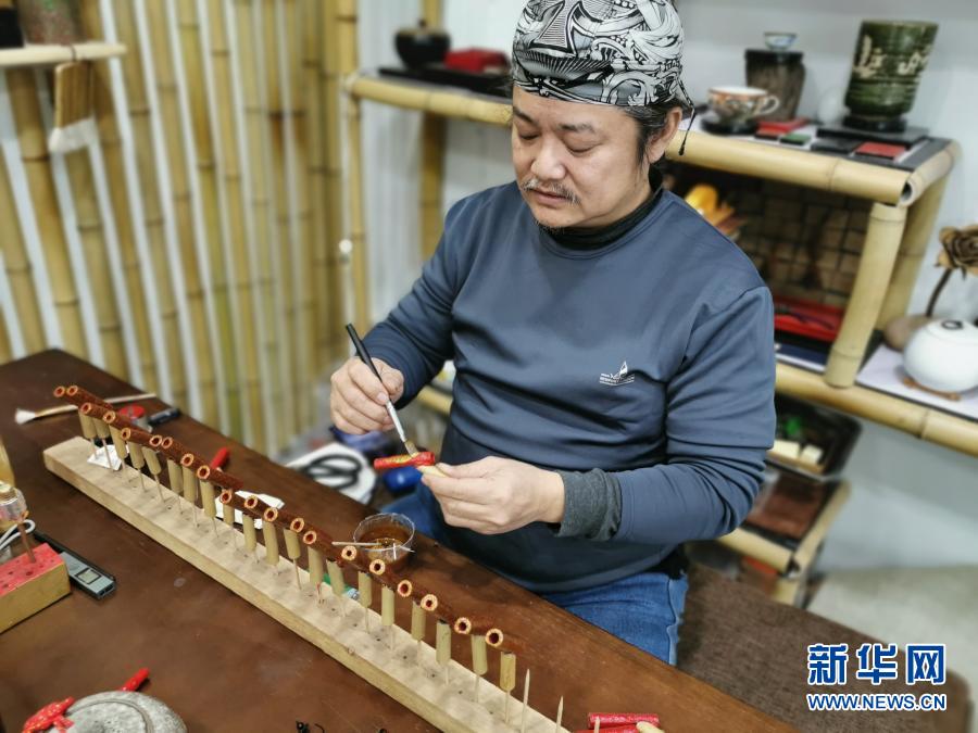 來自臺灣的大漆工藝師傅黃守堃在福州市臺江區的工作室給“鳥笛”上漆(1月11日攝)。新華社記者 凡帥帥 攝