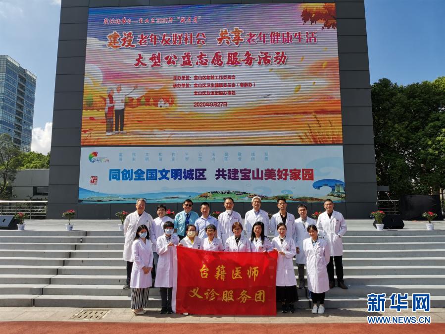 這是“臺籍醫師義診服務團”合影(2020年9月27日攝)。由謝國群(后排左四)牽頭共召集滬上20多名臺籍醫衛專家為上海市寶山區轄區內老年人義診。新華社發
