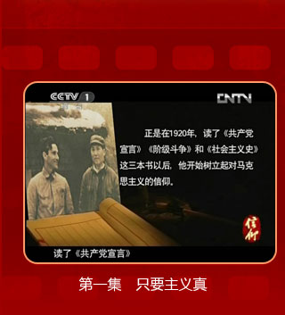 歷史文獻紀錄片《信仰》由中共中央組織部、中共中央文獻研究室、中共中央黨史研究室、中央電視臺聯合攝制。 歷史文獻紀錄片《信仰》,認真貫徹落實黨的十七屆六中全會精神和胡錦濤總書記在慶祝中國共產黨成立90周年大會上的重要講話精神,以黨的90多年歷程為背景,以理想信念教育為主題,通過講述革命、建設、改革各個歷史時期優秀共產黨員堅持理想信念、發揮先鋒模范作用、保持先進性和純潔性的故事,闡述了中國共產黨人的核心價值觀。[簡介] [解說詞] |