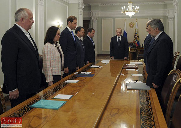 7月17日夜(ye),在俄(e)羅(luo)斯莫斯科州新奧加廖沃官邸,俄(e)羅(luo)斯總統普京(jing)(后)和一些高級別(bie)官員在經濟問題(ti)會議前為墜毀馬(ma)航MH17航班的遇難者默哀。普京(jing)當晚說,馬(ma)航客(ke)機失(shi)事悲(bei)劇發(fa)生在烏克蘭領空,烏克蘭無疑對此承擔(dan)責任。