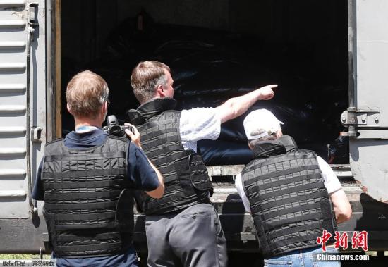 當地時間2014年7月20日,烏克蘭頓涅茨克Torez,馬航墜機遇難乘客遺體被裝上列車冷藏車廂將被運走。載有部分遺體的火車從距空難現場不遠的烏克蘭托列茲市出發,前往頓涅茨克市。火車離站前,身處空難現場的歐洲安全與合作組織(歐安組織)代表檢查了運載遺體的5節冷藏車廂。