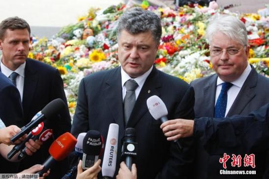 當地時間7月21日,烏克(ke)蘭(lan)基輔,烏克(ke)蘭(lan)總統波羅申科在荷蘭(lan)駐烏克(ke)蘭(lan)大使館外悼念馬航MH17遇(yu)難者。