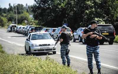 7月28日(ri),來自澳大利亞和荷蘭(lan)的調查人員前往墜機現場途中,烏克蘭(lan)民間組織在(zai)其車(che)隊(dui)后面封鎖道路(lu)。